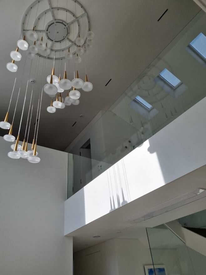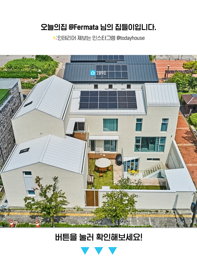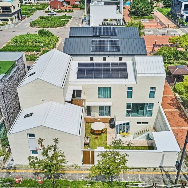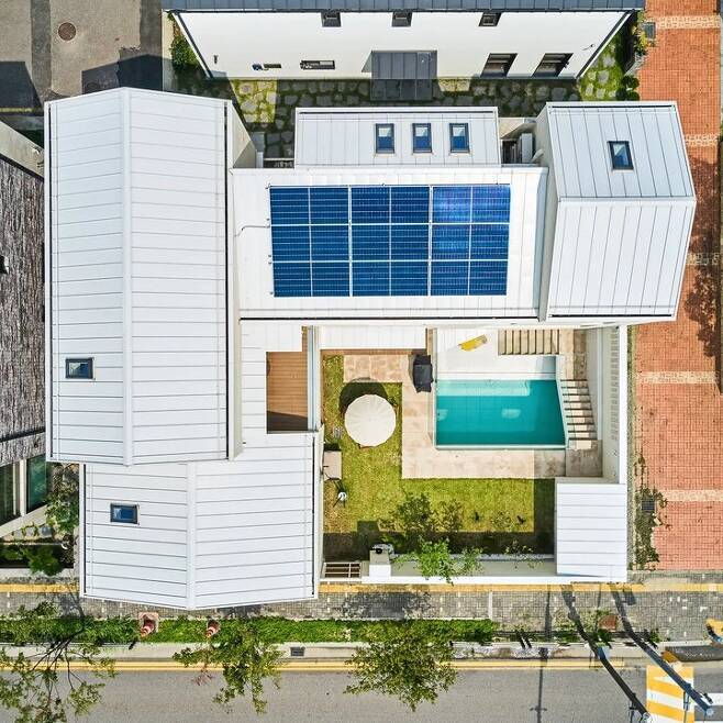 드론 촬영이 취미이신 저희 시아버지께서 찍어주신 항공샷, 저희 집 정원과 지하 수영장까지 한눈에 들어와서 제가 개인적으로 제일 좋아하는 사진이에요. 보통의 집과는 다르게 지붕을 흰색으로 마감하였습니다. 흰 지붕은 여름철 태양열을 덜 흡수해서 실내가 비교적 시원한 장점이 있습니다.