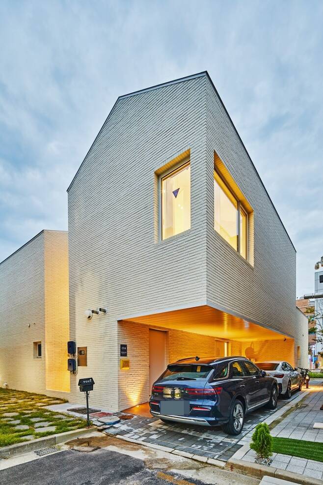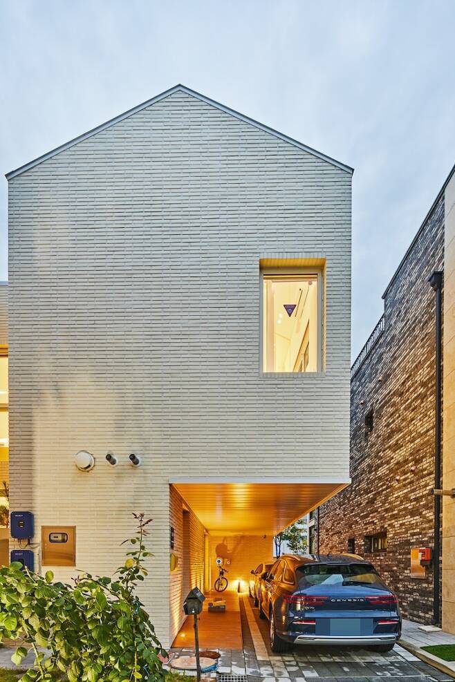 주차장은 기둥이 없는 캔틸레버 방식으로 만들었어요. 집의 외관이 개성 있기를 바랬던 마음도 있었고 주차장에서 비를 피하고 현관으로 들어오는 공간도 필요해서 주차장 윗부분을 2층으로 덮는 형태로 디자인하게 되었습니다.