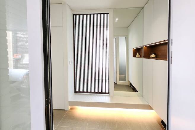 현관을 열고 들어가면 신발장과 손님용 외투 수납을 위한 웰컴장 그리고 중문이 보여요.