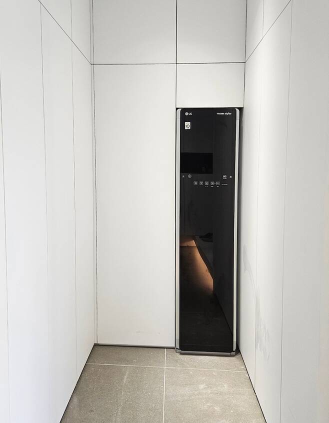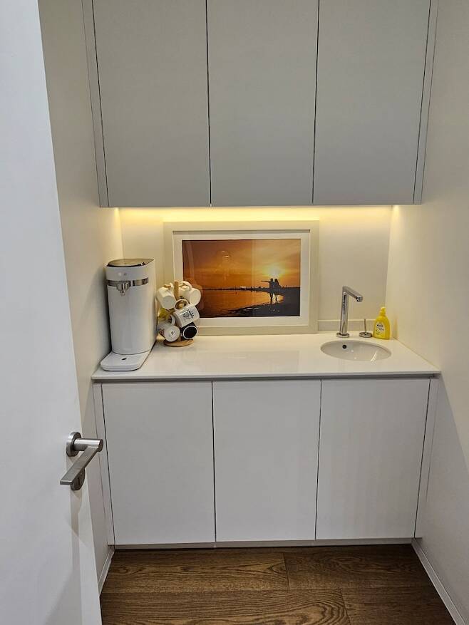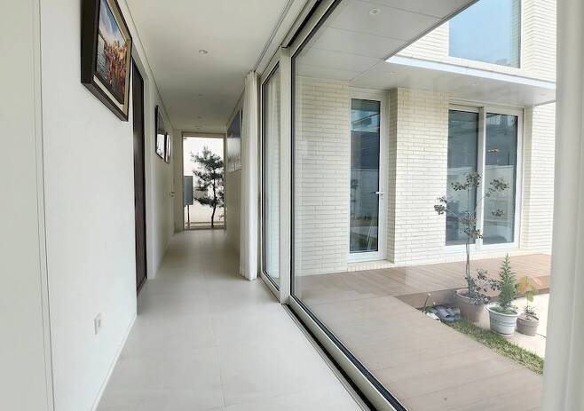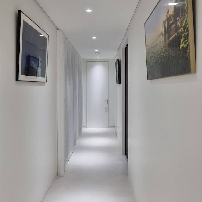 안팎이 전체적으로 화이트 톤인 저희 집은 복도도 마찬가지로 군더더기 없이 깔끔한 화이트로 마감했어요. 사진이 취미이신 시아버님 작품들을 복도를 따라 걸어 놓으니 집을 들어올 때 마치 사진전에 온 느낌이라서 더욱 기분이 좋습니다.
