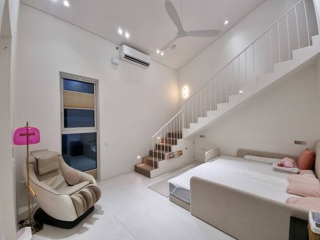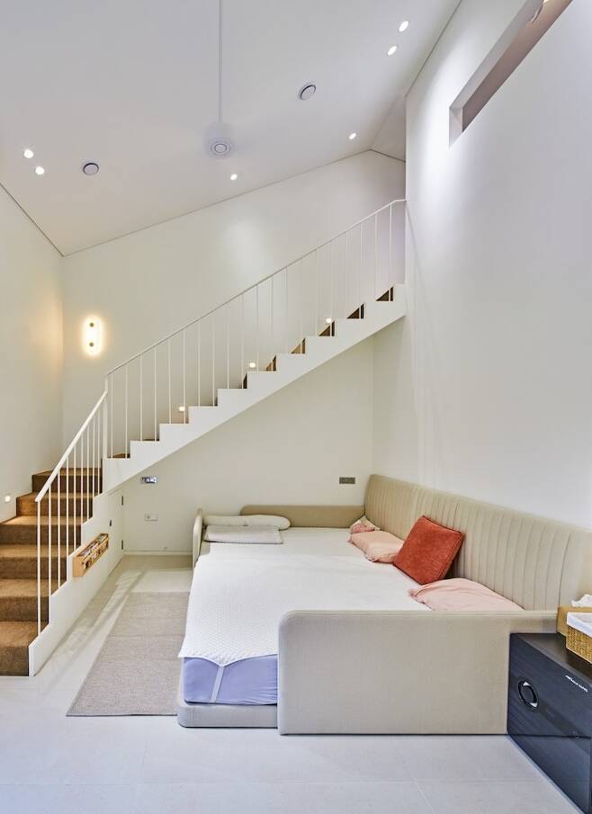 안방에는 작은 파우더룸과 드레스룸이 있고 계단을 올라가면 작은 아기 놀이방이 있어요. 별도의 공간이 없다보니 안방을 크게 설계했는데, 덕분에 지금은 패밀리 침대를 넣어 몸부림 심한 아기와도 편안하게 잘 수 있습니다.