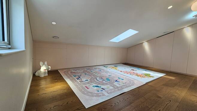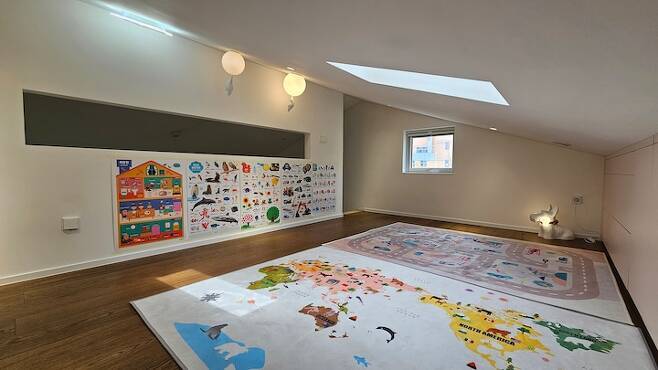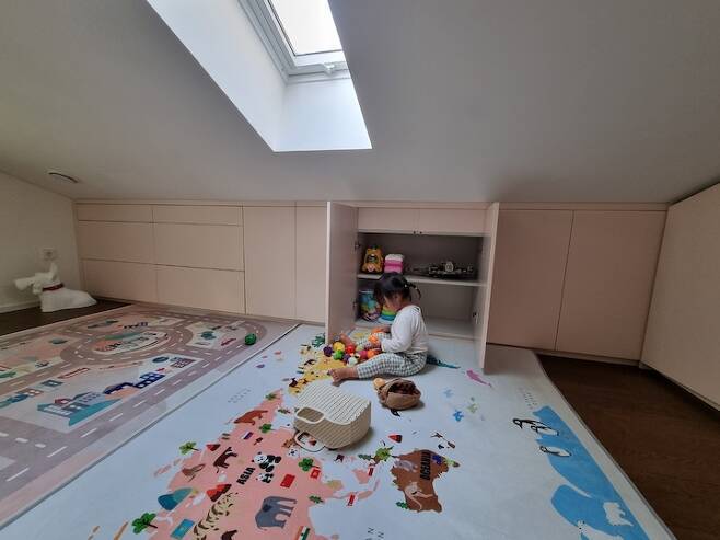 안방의 복층 다락으로 올라가면 자그마한 아기 놀이방이 나와요. 천장은 박공지붕 모양을 살려서 낮은 쪽은 아기만 허리 펴고 걸어 다닐 수 있는 높이라서 아기가 더 좋아해요.