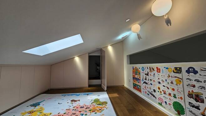 놀이방 천장에는 지붕창도 있어서 누워 있으면 하늘을 마주 볼 수 있어서 좋아요.