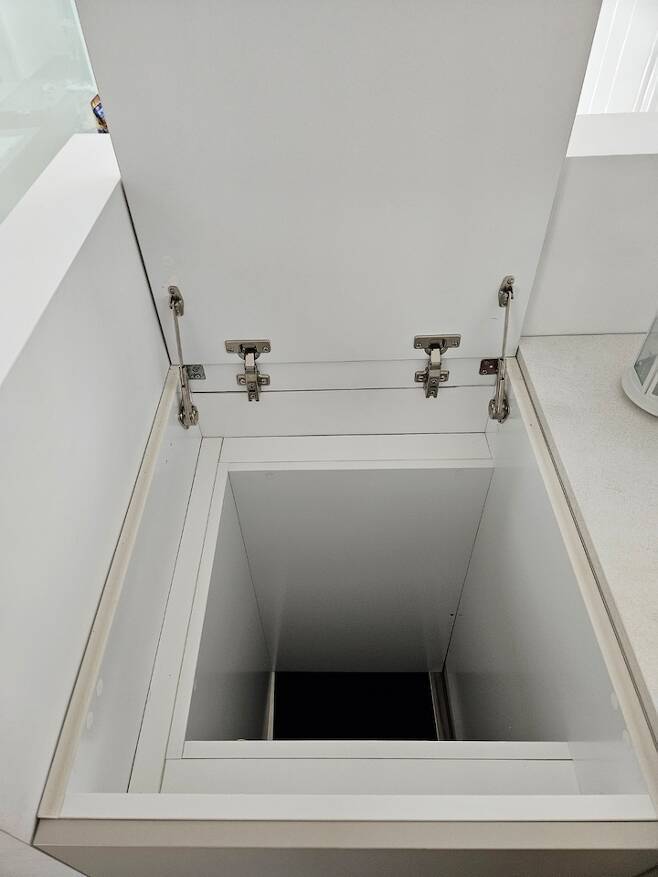 장 하나는 문을 위로 열게 만들어서 세탁실로 통하는 린넨수트 뚜껑으로 만들었어요.