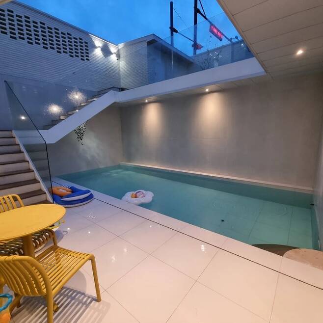 일부는 그늘이 생겨서 한낮에 수영할 때도 좋고 비도 약간은 가려주고요. 가스보일러를 활용한 온수풀이라 사계절 이용 가능하답니다.
