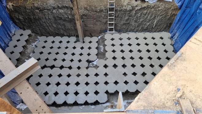 지하층부터 지상 2층까지 3개 층이 있는 집이라 하중이 컸고, 매립지인 탓에 지반이 약한 지역이었으므로 건물의 기초 하부에 지반 보강을 위한 팽이 기초를 시공했어요.