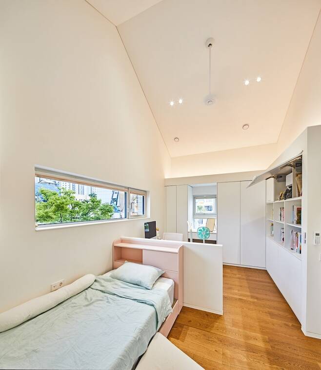 큰 딸아이 방은 동쪽과 남쪽에 창을 내서 밝고, 층고도 높아서 시원한 공간이 되었어요. 어릴 적부터 써오던 침대를 엄마가 직접 핑크 페인트로 리폼 해봤어요.