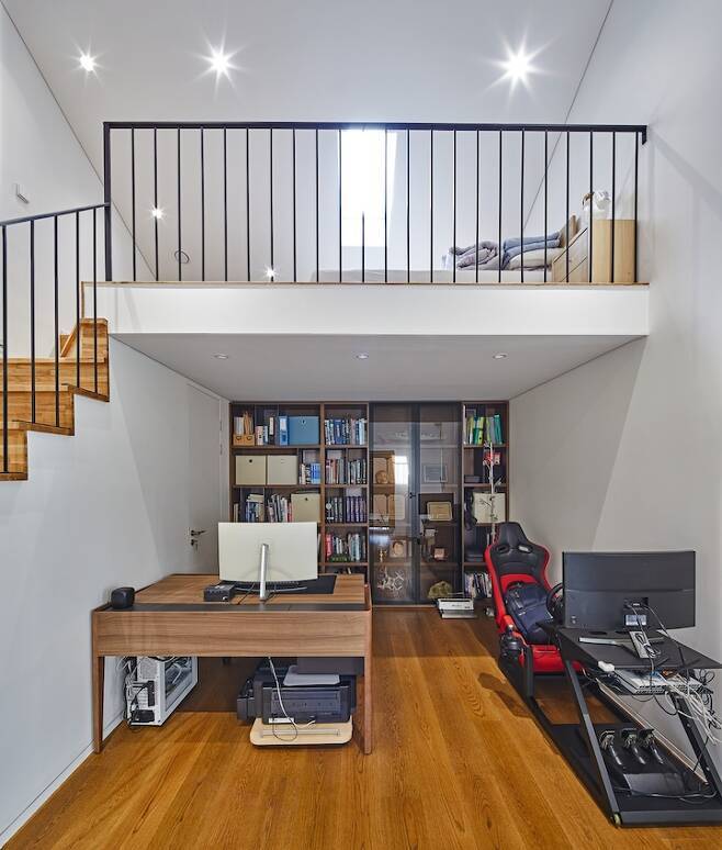 2층에는 남편의 동굴인 서재도 있어요. 중후한 느낌을 살리려고 어두운 우드톤으로 책장을 짜 넣고 군데군데 브론즈 색 철제 프레임으로 포인트를 줘 봤어요.