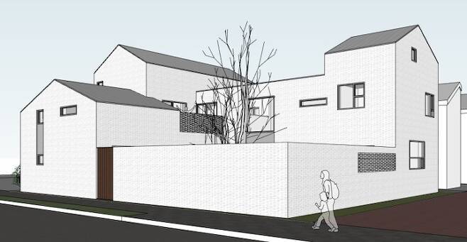 저희 집 부지는 정남향의 직사각형 형태로 횡단보도 및 공원으로 가는 보행자 도로와 인접하여 사람들의 통행이 많은 편입니다. 그래서 건축 한계선 안쪽으로 담장을 계획하여 사생활을 보호할 수 있도록 구성하고 건물은 부지의 북쪽과 서쪽으로 배치했어요.