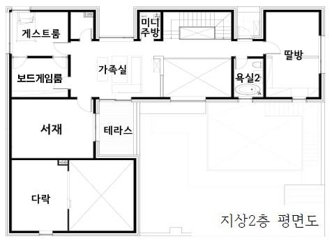 2층에는 가족들의 개별 공간을 두었고, 넓은 가족실과 테라스가 있어 편안한 휴식을 취할 수 있어요.