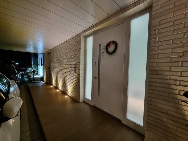저희 집 진입로 모습이에요. 비를 살짝 피할 수 있는 야외 주차장과 나무 느낌의 데크로 만든 보행로를 따라 들어오면 집보다 더 하얀 현관이 나와요.