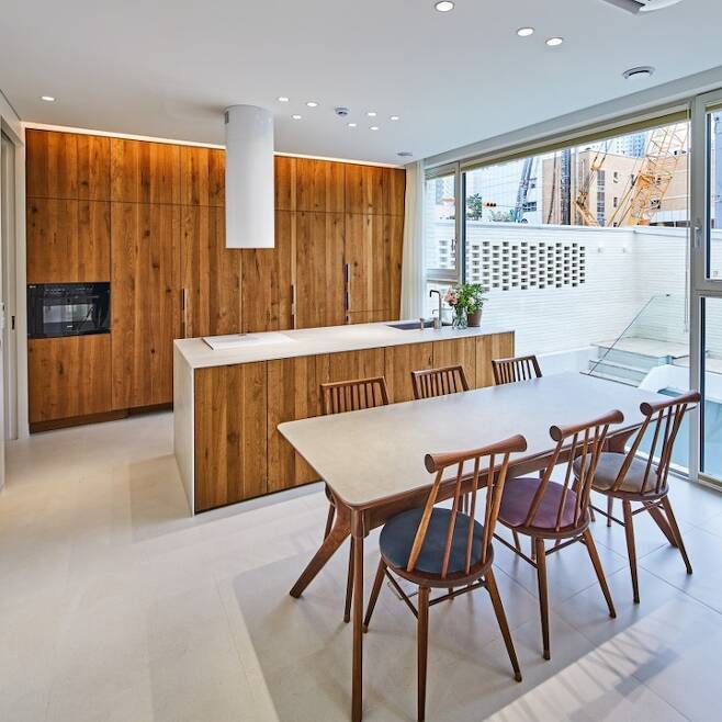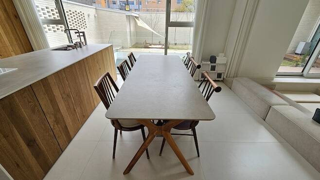 천연 무늬목과 세라믹을 활용해 깔끔하면서도 따뜻한 주방 느낌과 잘 어울리는 식탁을 찾으려고 많이도 보고 다녔어요.