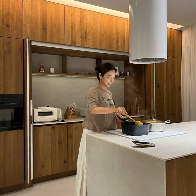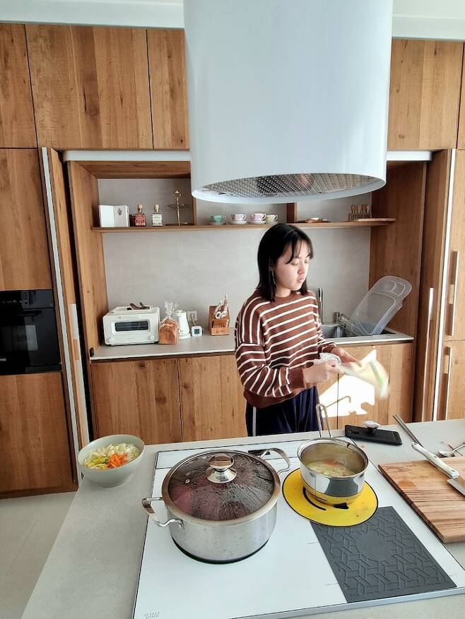 가끔은 큰 딸아이가 동생을 위해 요리하는 공간이 되기도 하구요. 화이트톤이 일색인 집에서 따뜻한 나무 느낌의 주방은 사랑이 피어나는 곳인 것 같습니다.