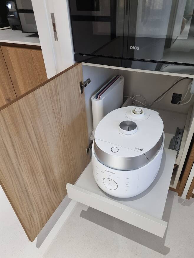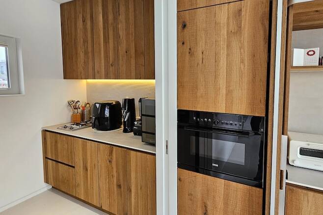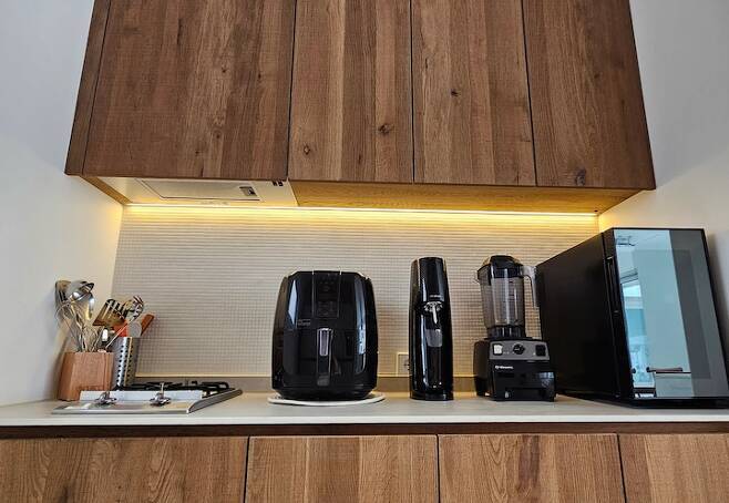 올려놓고 써야 하는 에어프라이어랑 미니 와인 냉장고, 탄산수 제조기, 블랜더 등은 보조 주방에 두고, 손님이 오실 때는 문만 닫으면 한결 더 깔끔하게 보인답니다.