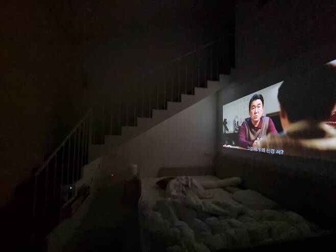 안방 벽에 빔프로젝터를 쏘면 영화관처럼 변신합니다. 아기를 재워 놓고 영화 보는 재미가 쏠쏠하지요.