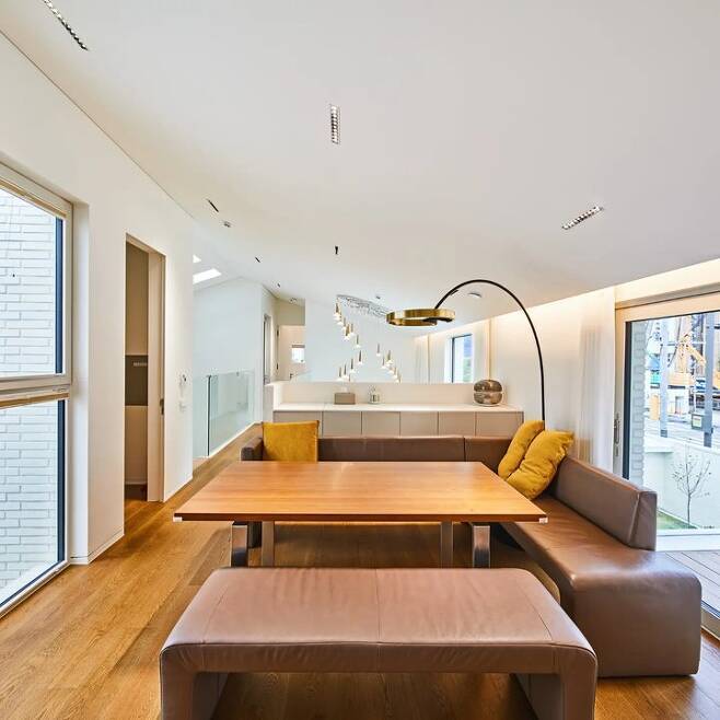 긴 복도를 따라 들어가서 복도 끝에서 시선을 돌리면 거실과 주방이 한눈에 펼쳐지는 구조입니다.