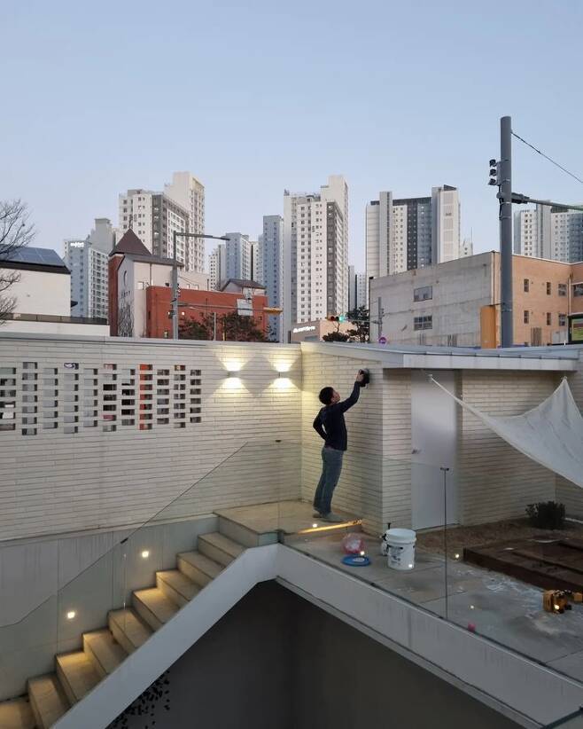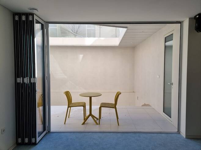 그리고 학교 앞 인도에 위치해 있어서 프라이버시를 지키기 위해 실외 창고와 연결된 담을 쌓아서 집 안에서는 어디든 편하게 다닐 수 있게 만들었어요.