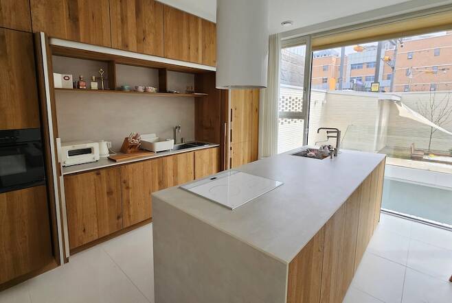 11자 형식으로 배치한 주방은 손님이 오시거나 정돈된 느낌을 원할 때 뒤에 있는 슬라이딩 문을 닫고, 평소에는 개방해서 넓게 사용하고 있어요.