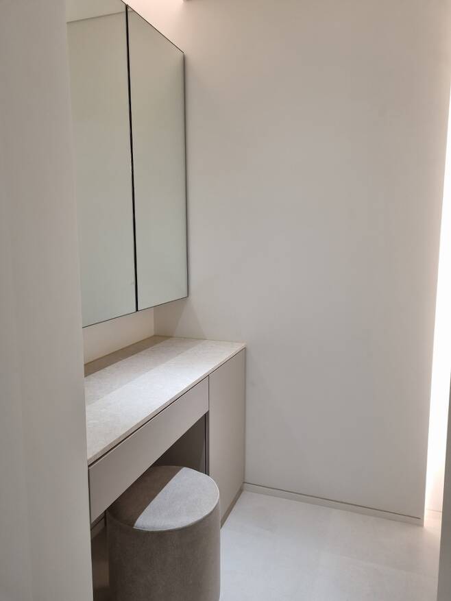 여기는 작은 파우더룸이에요. 화장품을 최대한 깔끔하게 수납하기 위해 거울을 따로 두지 않고 수납장의 도어를 거울로 만들었어요.