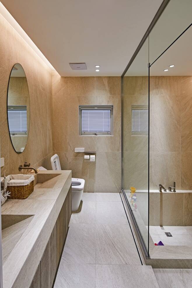 안방 욕실은 층고가 높아 유리 파티션도 유리 전문 업체에 특별 주문하여 제작했어요. 파티션의 왼쪽은 건식 공간으로 드레스룸 및 안방과 단차 없이 연결되어 아기가 다니기에도 편리하게 만들었어요.