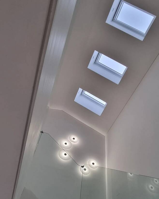 저희 집 계단은 지하에서부터 2층까지 연결되어 있어요. 채광을 위해 계단실에 지붕창을 만들었어요. 평소에 환기할 때도 잘 사용하고 있고요.