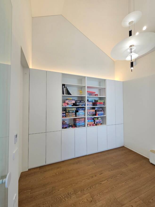 게스트룸과 연결된 보드게임룸이에요. 보드게임이 취미인 남편이 하나하나 모아온 것들이 많아서 장을 짜 넣어 봤어요. 조명 아래에는 작은 테이블과 의자를 놓을 예정이에요.