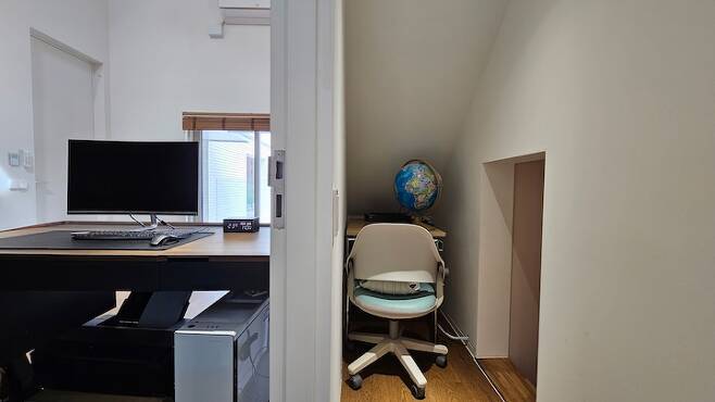 이 작은 공간에는 비밀이 숨어있어요. 아기 옷장 중 하나의 문을 열면 비밀의 공간을 통해서 2층에 있는 아빠 서재로 가는 길이 나와요. 모두가 아는 공공연한 비밀의 문이죠. 원래는 아기 몰래 다니려고 했는데 오히려 아기가 이 문을 통해 집 전체를 빙빙 돌면서 놀고 있습니다.