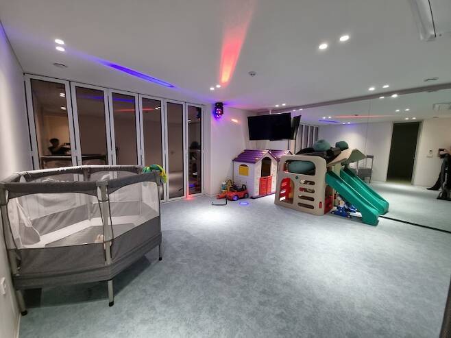 아기 놀이방에서 폴딩도어를 열면 지하 썬큰 수영장으로 나갈 수 있어요.