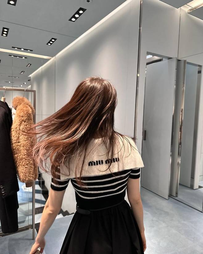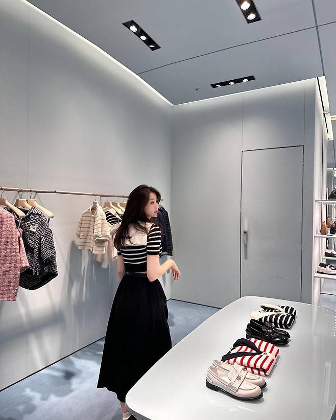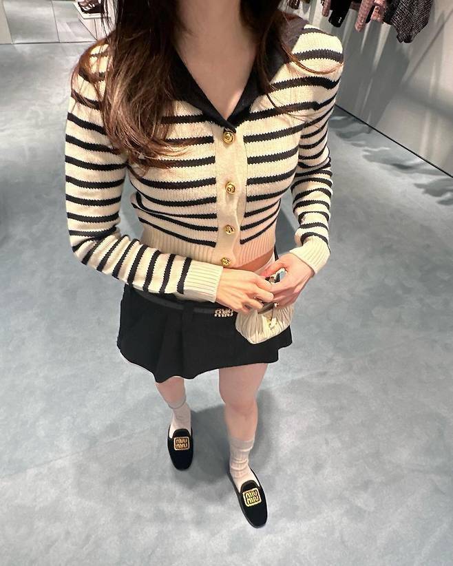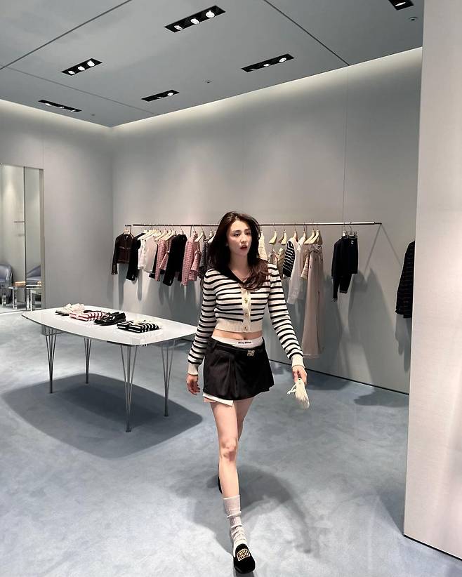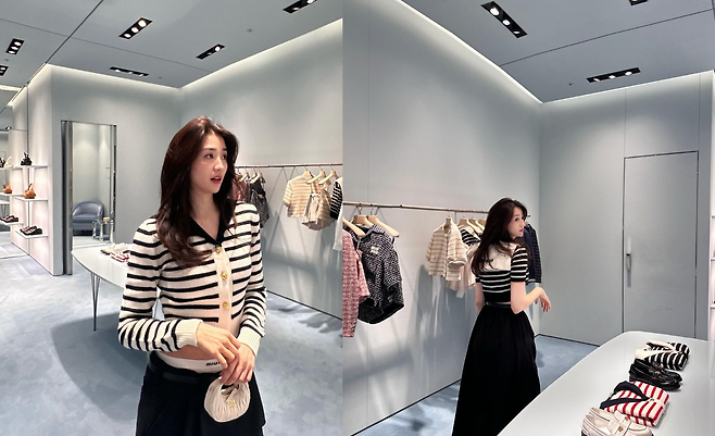 사진 속 박하선은 금장 단추가 있는 스트라이프 브이넥 크롭 가디건과 블랙 미니스커트를 입고 군살 없는 몸매를 자랑했다. 또 다른 사진에서는 반팔 스트라이프 브이넥 크롭 가디건을 입고 블랙 플레어 스커트를 입어 청순한 스타일을 공개했다.