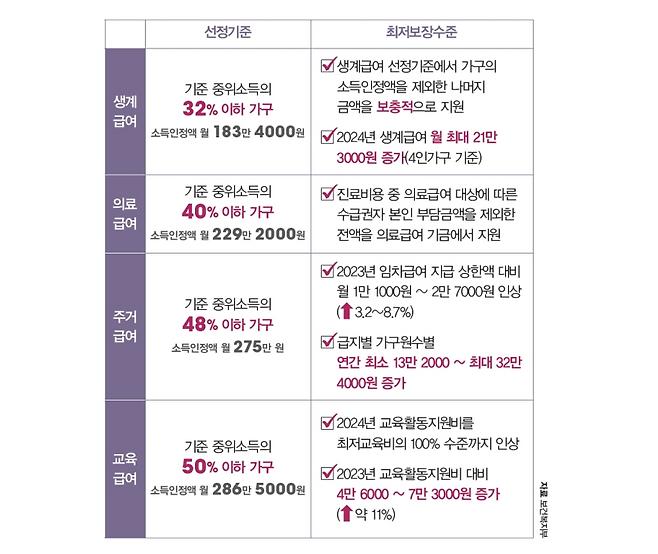 이밖에 의료급여와 교육급여는 2023년과 동일하게 각각 40%, 50%로 유지합니다. 의료급여는 기존과 동일하게 수급에게 급여 대상 항목 의료비 중 본인 부담금을 제외한 전액을 지원합니다. 교육급여는 2024년 교육활동지원비를 초등학교 46만 1000원, 중학교 65만 4000원, 고등학교 72만 7000원 등 최저교육비의 100% 수준으로 인상합니다.