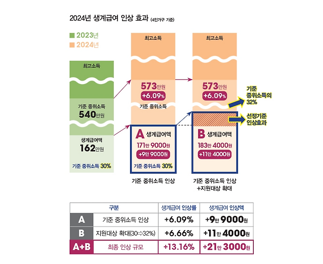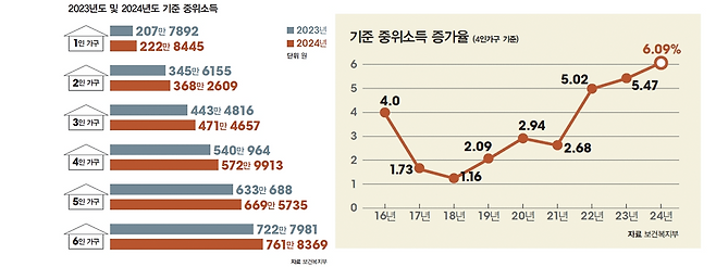 기준 중위소득 인상폭은 2015년 맞춤형 급여체계로 전환된 이후 2023년에 이어 2년 연속 가장 큰 폭을 기록했습니다. 역대 최대 인상폭이기도 합니다.