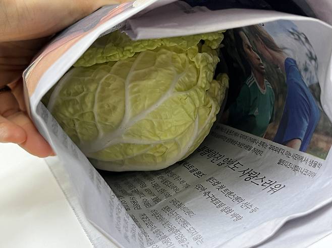 알배기 배추는 그냥 냉장고에 넣지 마시고 신문지 1~2겹에 둘둘 감싸 줍니다. 신문지로 감싸면 수분 증발을 막아서 싱싱함이 유지됩니다.