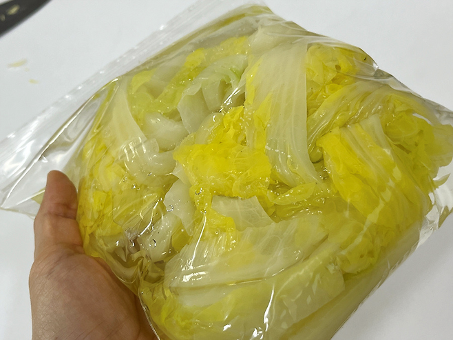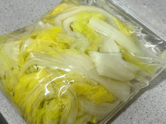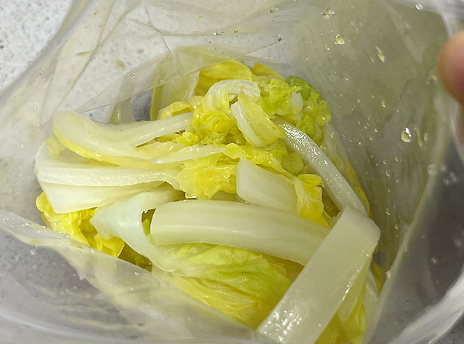 배추는 물과 함께 지퍼백에 넣어서 냉동실에 보관합니다. 물과 함께 넣으면 배추가 딱딱해지거나 수분이 날아갈 염려가 없습니다.