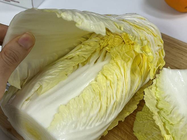 알배기 배추는 잎을 한 장씩 떼어 낸 후 크기가 너무 큰 경우 먹기 좋게 썰어 주세요.