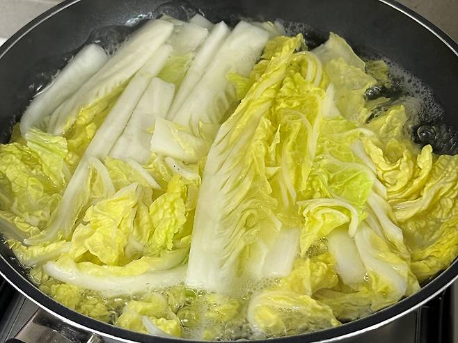 배추 심지 부분이 부드러워질 때까지 끓는 물에 데쳐 줍니다. 너무 오래 데치면 이파리가 흐물흐물해지므로 익힘 정도를 계속 확인하세요.