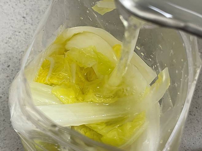 데친 배추는 찬물에 넣어 열기를 식힙니다. 냉동실에 얼리기 전 열감을 빼주는 것이 좋습니다.