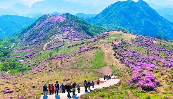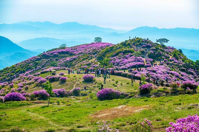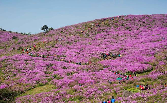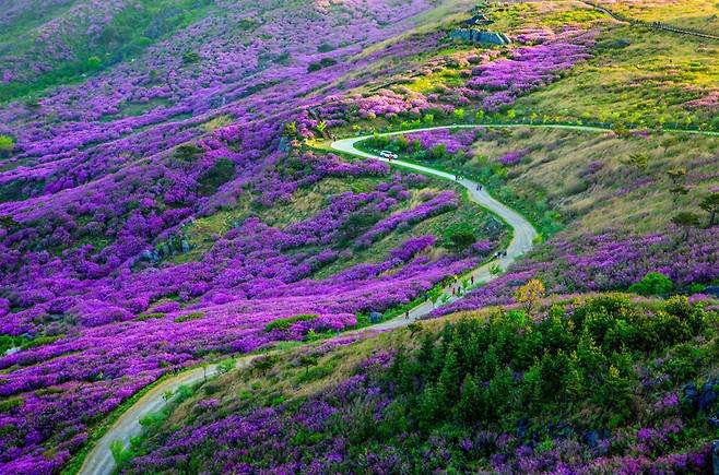 이곳이 특히 유명한 이유는 단연 철쭉 군락이다. 4월 말에서 5월이면 수십만 평에 달하는 고원 위로 선홍빛 철쭉이 가득 피어나며, 산비탈을 따라 끝없이 이어지는 꽃밭이 장관을 이룬다. 바람이 불 때마다 꽃들이 일렁이며 만들어내는 모습은 마치 분홍빛 파도가 흐르는 듯한 느낌을 준다.