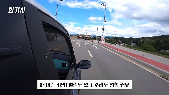 여름철에 에어컨 틀 때는 히터보다 조금 나은데, 거의 한 60km 이상을 타는 것 같아요. 근데 에어컨을 켜면 컴프레서가 돌아가면서 진동이 어마어마해요. 이거는 내가 시원하기 위해서 불안을 감수해야 해요. 차가 터질 거 같아요. 떨림도 있고 소리도 엄청 커요. 에어컨을 3단으로 틀어놓으면 탑승자 대화 소리가 거의 안 들릴 정도예요. 대화가 안 돼요. 공장 안에 있는 거 같아요. 다만 에어컨이 있다는 자체만으로 충분하죠.