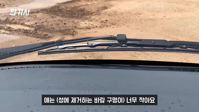 또 제가 좀 진지하게 캠시스라는 회사에서 SNS 마케팅이라든지 관심을 되게 많이 갖고 계시더라고요. 다음 후속도 나올 거 아닙니까? 이걸 보셔야 하는데, 와이퍼가 반절도 안 돼요. 와이퍼가 하나인데 가동 범위 자체가 어쩔 수 없이 좁겠지만, 한쪽은 아예 안 닦여요. 비 오면 시야가 진짜 절반이 돼요.
