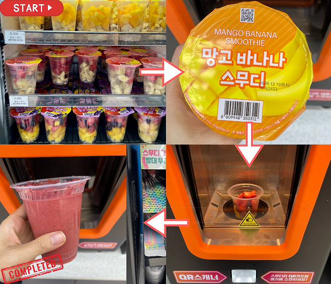 셀프 스무디 종류는 ‘망고 바나나’, ‘딸기 바나나’, ‘딸기 블루베리 망고’ 총 세 가지다. 신메뉴는 추후 추가 될 예정으로, 일본 편의점의 케일, 멜론 등 다양한 메뉴와 비교하면 과일 선택의 폭이 좁은 점은 아쉽다. 가격은 모두 3,000원. 편의점 음료치고 저렴하진 않지만 생과일을 통째로 갈아 만들고 카페 스무디의 절반 가격이라는 점이 매력적이다.