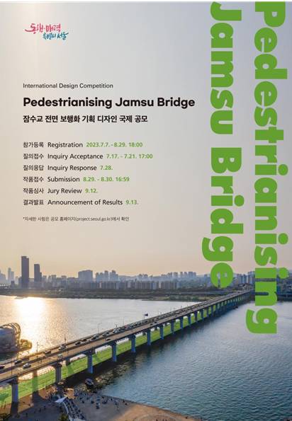홍선기 서울시 미래공간기획관은 "다양한 분야 심사위원들의 공정한 평가를 통해 국내·외 전문가들의 참신하고 혁신적인 아이디어들이 선정될 것으로 기대하고 있다"며 "도시·건축 디자인 혁신과 한강의 변화를 위한 서울시의 노력과 다양한 국내·외 전문가들의 적극적인 참여를 거쳐 새롭게 탄생하는 잠수교의 모습을 기대해 달라"고 말했다.