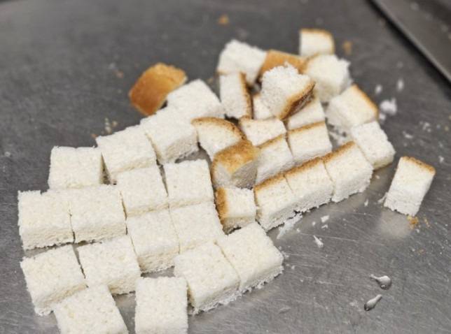 식빵을 네모 모양으로 자른 뒤 버터 한 조각과 기름 조금 둘러 녹여준 다음 식빵을 넣어주세요.