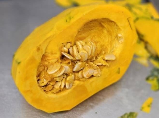 숟가락을 사용하여 단호박 속을 긁어내주세요