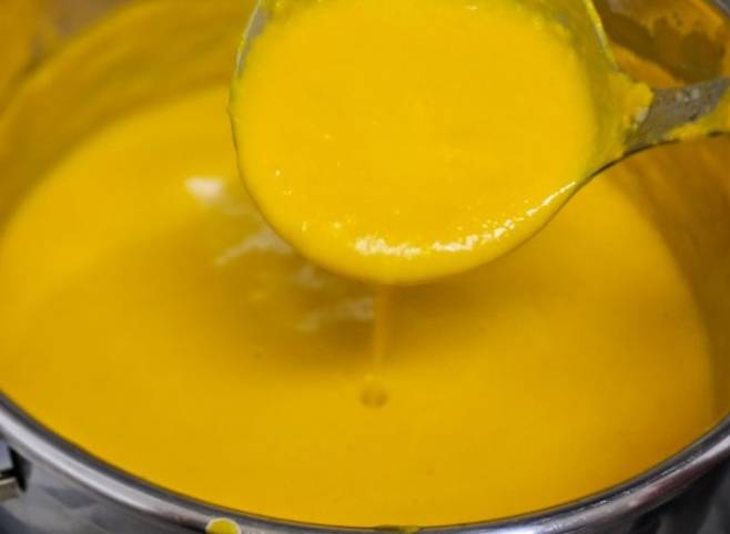 다 익은 단호박은 좋아하는 식감에 따라 냄비에서 으깨거나 블랜더로 곱게 갈아준 다음 우유와 물을 1:1로 넣은 물과 함께 은근하게 끓여주세요.