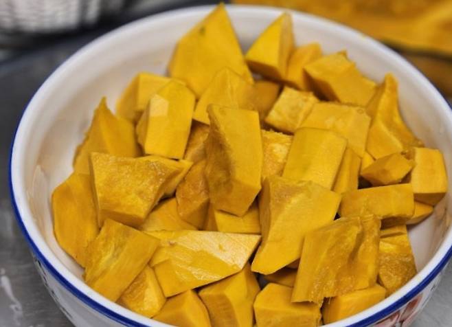 단호박을 적당한 크기로 자르고 그릇에 담아 물 반컵 넣고 전자렌지에 9분 정도 돌려주세요.