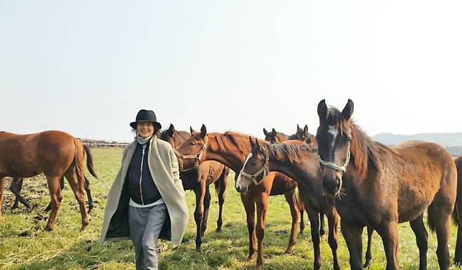 배종옥은 목장에서 베이지 톤 롱코트와 블랙 이너웨어를 매치해 세련된 캐주얼룩을 연출하고 있다. 블랙 페도라 햇을 포인트 아이템으로 활용해 도시적인 감각을 더했으며, 자연스러운 미소와 함께 편안하면서도 우아한 분위기를 완성했다.