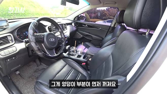 운전석 시트가 불편하다는 평도 있는데, 그것도 일리 있어요. 쏘렌토 시트의 스폰지 같은 게 엉덩이 부분이 먼저 꺼져요. 엉덩이 쪽이 먼저 꺼져서 비교적 앞에가 지금 5년 탔는데도 아직 빵빵해요. 그래서 나중에는 앉아 있을 때 중심을 잡으려고 허벅지에 힘이 많이 들어가니까 운전할 때 허리가 되게 아프죠. 그래서 저 같은 경우에는 시트 뒤에 뜯어가지고 시트 스트럿바를 한 군데만 설치하니까 시트 포지션이 조금 올라오더라고요. 지금은 시트 포지션 아주 좋아요.