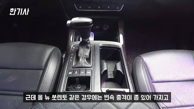 그리고 저는 개인적으로 단점이라고 생각하는 게 이 차 미션이 6단 미션이거든요. 저단 1~2단에서 좀 울컥거리는 게 있고 5단에서 4단으로 킥다운할 때는 좀 심해요. '쿵!' 소리가 나요. 더 뉴 쏘렌토 같은 경우에는 8단 들어가는데 8단은 오르막에서 감을 못 잡는다는 말이 많대요. 친구가 타는 더 뉴 쏘렌토를 타봤는데 오히려 변속되는 느낌은 8단이 더 좋은 것 같아요. 근데 이 차 같은 경우에는 변속 충격이 좀 있는 편이라 미션을 달래주면서 가야 해요.