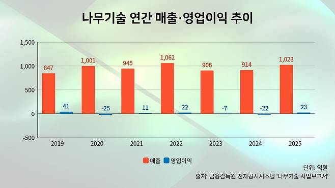 재무적으로는 연결 기준 회복세와 별도 기준 부담이 엇갈리는 흐름이 함께 나타났다. 나무기술의 지난해 연결기준 매출은 1023억원으로 전년 914억원 대비 11.9% 증가했다. 영업이익은 23억원으로 흑자 전환에 성공했다.