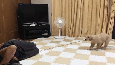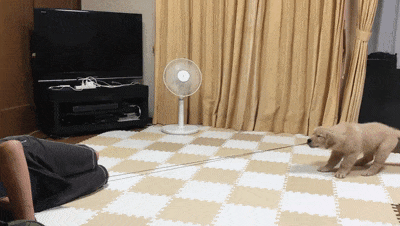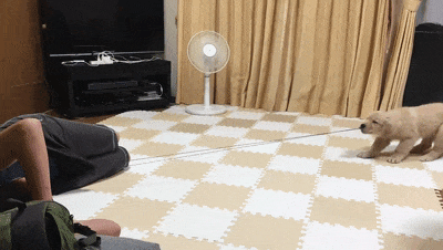 한참 동안 이어진 줄다리기 끝에, 강아지는 지쳤는지 결국 바지끈을 놓아버렸습니다. 힘껏 줄다리기를 하느라 입이 아팠던 모양입니다. 강아지는 끈을 놓자마자 곧바로 다른 장난감을 찾아 나섰습니다.